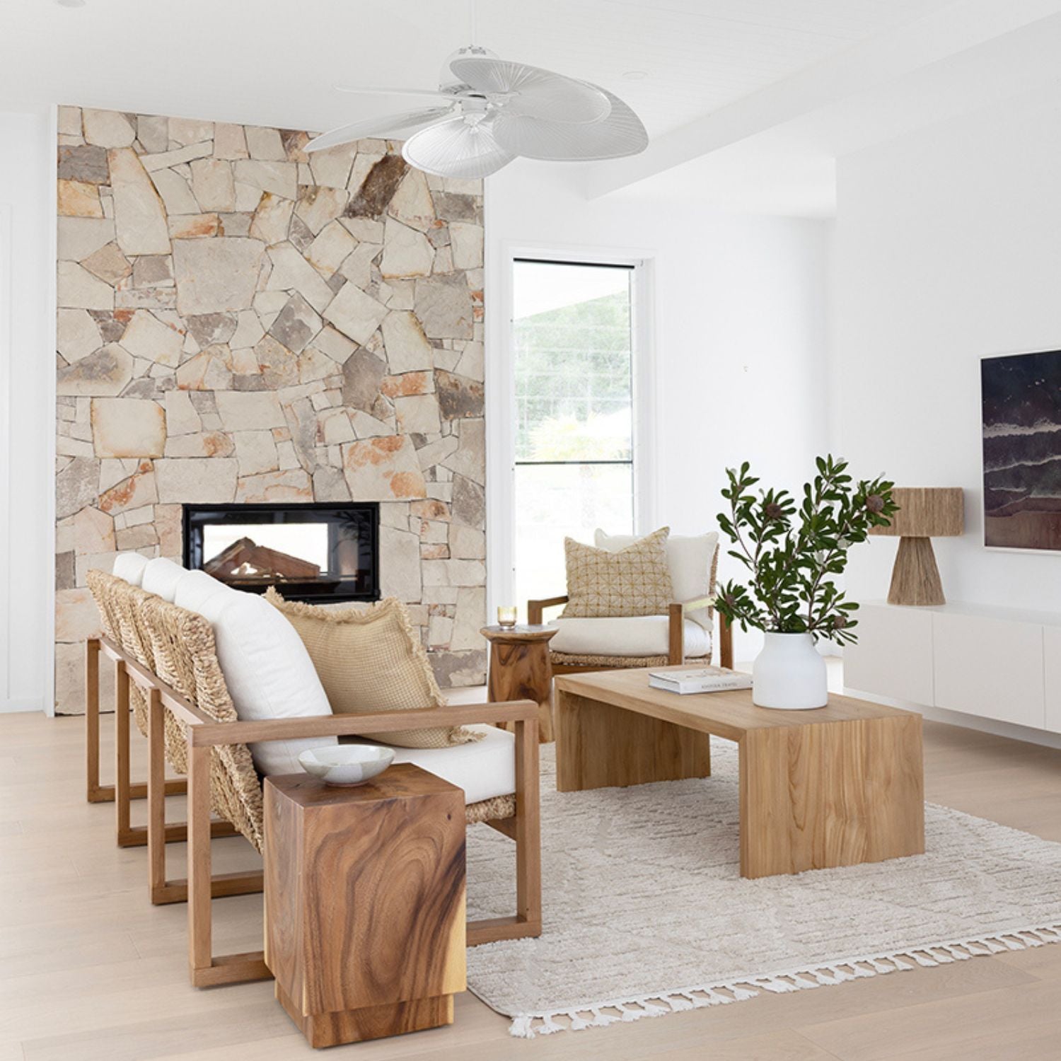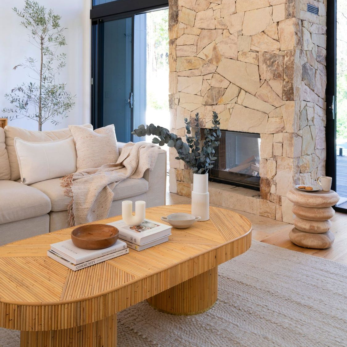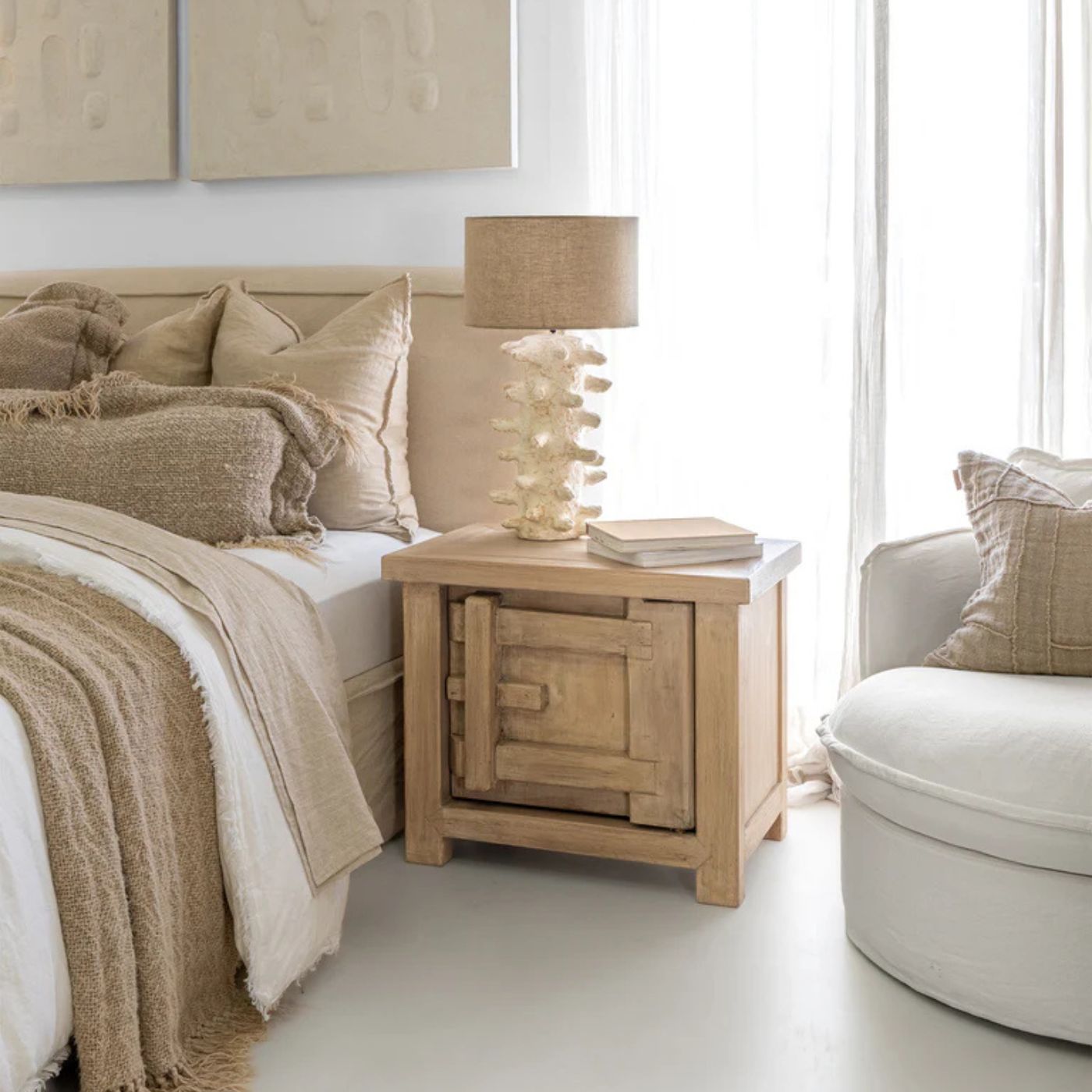 Natural materials and soft forms create a grounded coastal aesthetic with quiet luxury.