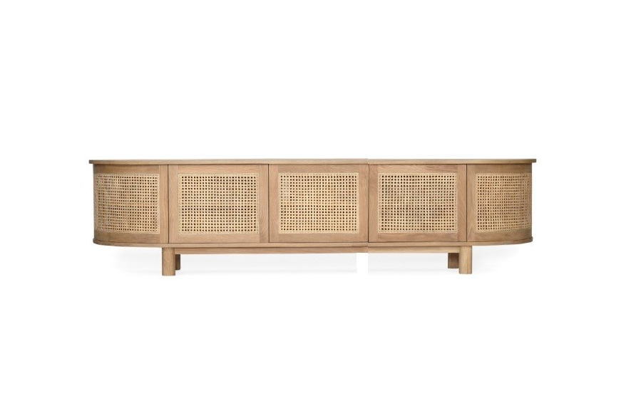 Beautiful Amercian Oak five door entertainment unit with rattan detailed doors and curved ends, Magnolia Lane - front view