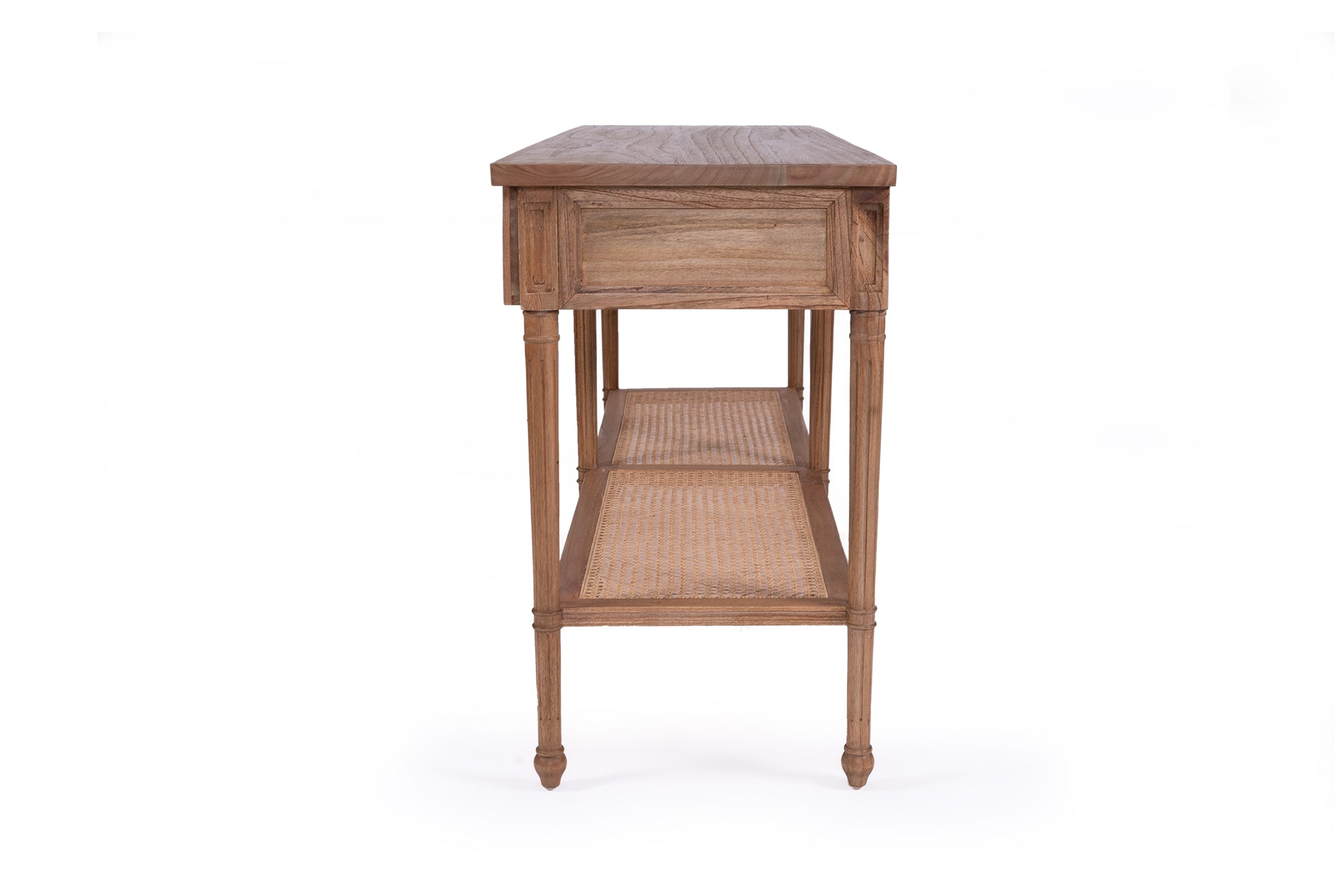Crafted from sustainably sourced mahogany, the Whitsunday Wide Console Table features a timeless natural finish and sturdy construction. With two spacious drawers and a lower shelf accented by classic rattan details, this table offers versatile storage perfect for displaying décor or keeping beach essentials within reach at your holiday retreat.